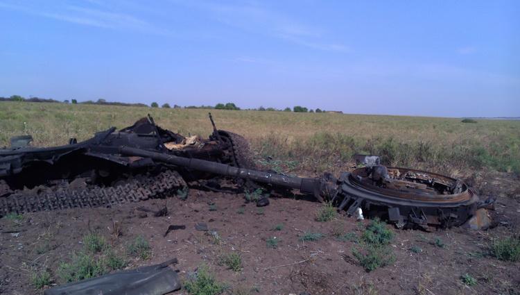 Уничтоженный танк Т-64, который был на вооружении одного из отрядов сепаратистов, которые продвигались по «серой» зоне вдоль границы в начале августа 2014 года. Танк с экипажем погиб в районе хутора Красная Заря - неподалеку от КПП Мариновка (фото поисковика Владимира Дорофеева)
