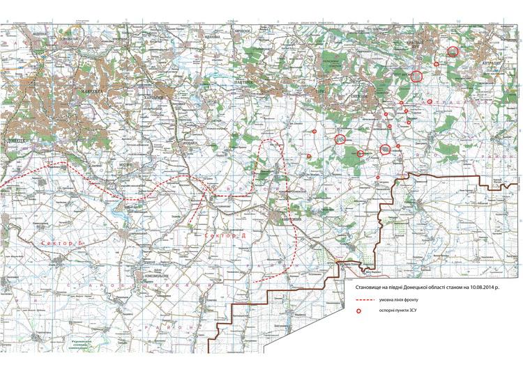 Карта №1. Реальное расположение частей Вооруженных Сил Украины по состоянию на 10-е августа 2014 года. От села Степановка до села Боково-Платово опорные пункты занимали части 30-й механизированной бригады. В районе с. Петровского (восточнее Саур-Могилы) находилась 3-я батальонно-тактическая группа 51-й механизированной бригады