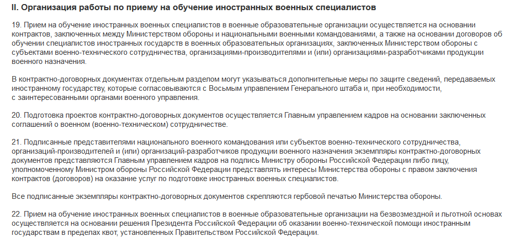 В п. 23 Постановления правительства Российской Федерации от 29 октября 2015 г. N 1164 «Об оказании Министерством обороны Российской Федерации услуг по подготовке и обучению военных и военно-технических кадров иностранных государств» четко сказано: