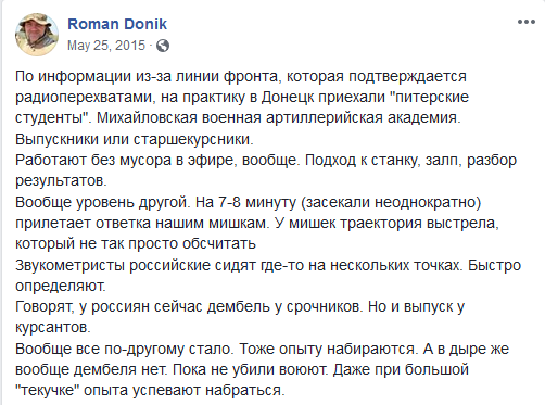 С похожими заявлениями, но уже в апреле 2016 г. выступила пресс-служба ГУР Минобороны Украины: «27 апреля с.г. к бывшему Донецкому военному лицею (ул.Куприна 1) прибыла группа слушателей (около 50 офицеров) Михайловской военной артиллерийской академии (Санкт-Петербург) ВС РФ».