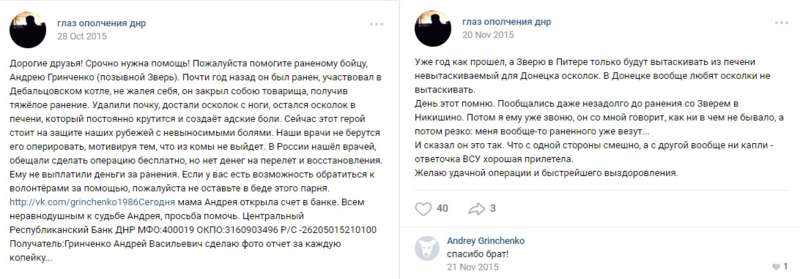 14 декабря 2015 г. Виктор Пешков, координатор организации «Феникс Донбасса», которая занимается сбором средств на лечение боевиков, выкладывает на своем канале YouTube видео, в котором Андрей Гринченко благодарит доноров за оказанную помощь.
