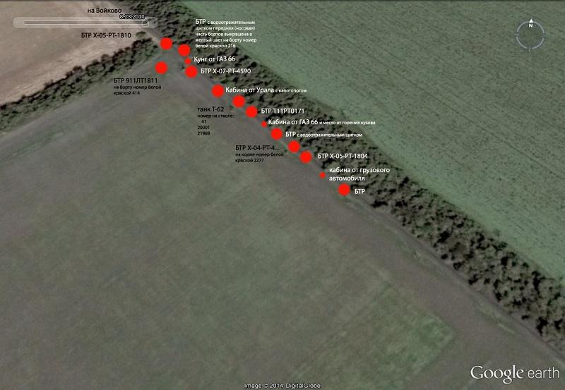 Схема с расположением на дороге между селами Новазаровка и Войково разбитой техники 92-й бригады, которую видели воочию поисковики (без техники, которая была отремонтирована и забрана сепаратистами. Схема Павла Нетесова)