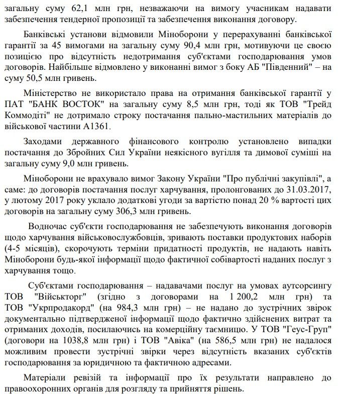 "Минобороны не учло требований Закона Украины" О публичных закупках ", а именно: к договорам поставки услуг питания, пролонгированных к 31.03.2017, в феврале 2017 заключило дополнительные соглашения по стоимости более 20% стоимости этих договоров на общую сумму 306,3 млн гривен", - говорится далее в ревизии.