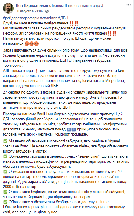 Об этом сообщил на своей странице в Facebook заместитель Министра регионального развития Лев Парцхаладзе.