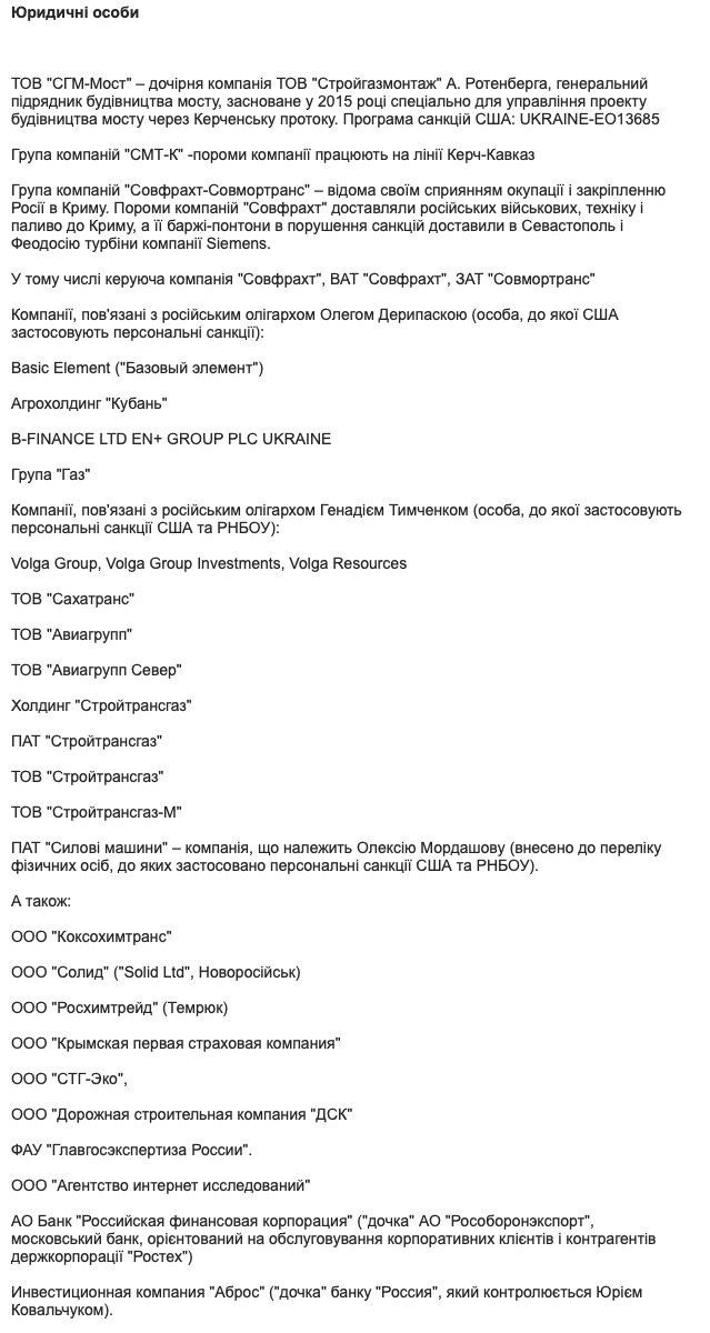 «В июле Европейский Союз ввел санкции против шести российских компаний, которые строили Крымский мост. Президент их тоже одобрил и обратился на этот раз в МИД с поручением «усилить работу по дальнейшему ужесточению санкций против российского агрессора и любых физических или юридических лиц, связанных с попыткой аннексии и временной оккупации украинского Крыма», — сказала она.