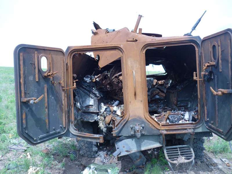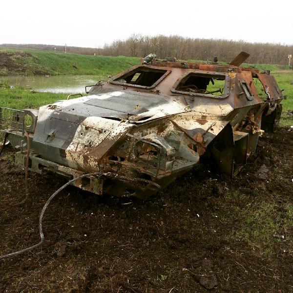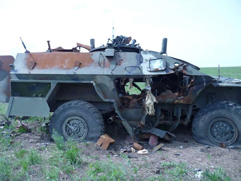 В то время на позиции у нас находилось около 20 человек. Если бы сепары знали, что нас там так мало, ни за что бы не отступили. В бою враг потерял 2 танка, 2 Урала, МТЛБ и 2 БТР «Выстрел» (прим.редакции: «Выстрел» одна из модификаций КамАЗ-43269, в данном случае указана ошибочно и подразумевается «Дозор»). Потери живой силы подсчитать было невозможно. Когда через 2 недели пошли смотреть на разбитую колонну, то обнаружили там много обгоревших и разорванных тел». На фото на горизонте горят два подбитых российских танка.