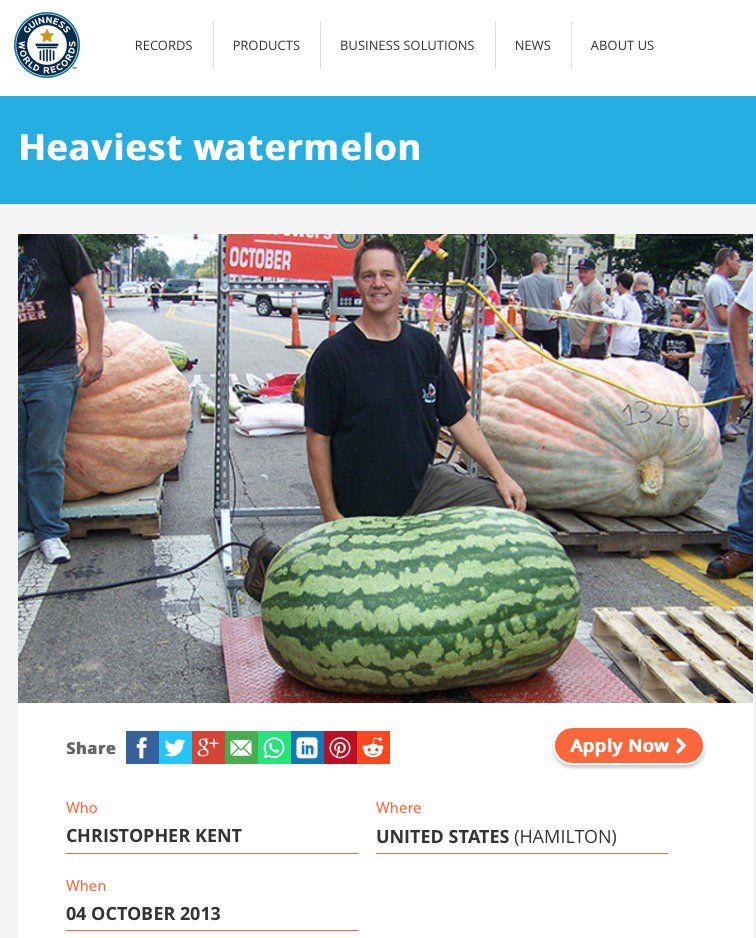 Отметит, что данный арбуз также не может считаться самым большим в мире. В октябре 2013 года «Книга рекордов Гиннеса» зарегистрировала рекорд — американец вырастил арбуз весом 159 килограмм.