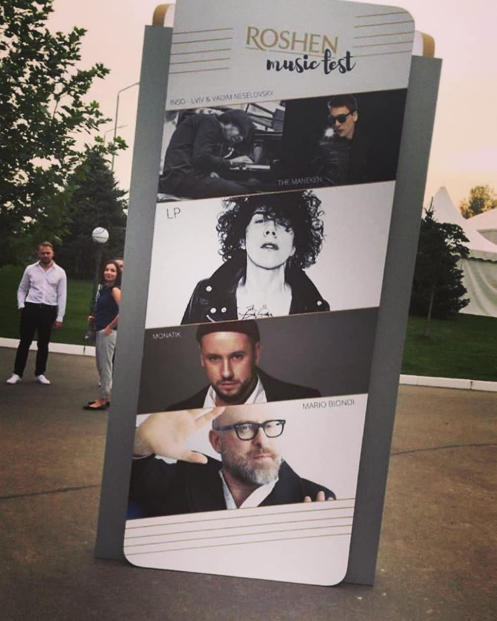 Атмосферу праздника создавал декор в белых тонах и нарядные официанты. На улице – столики фуршетного плана, рядом с которыми приходилось стоять. Кроме того, были кабинки для фото, где сразу можно было сделать снимки, на с логотипом Roshen Music Fest.
