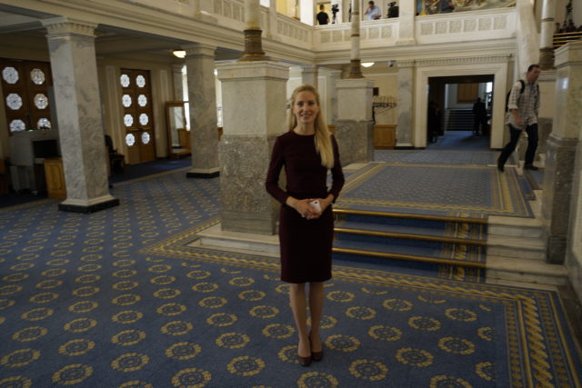 Депутат от фракции «Блок Петра Порошенко» Ольга Червакова не считает «мужскую» работу причиной отказаться от образа хрупкой леди. Сдержанные тона и строгие линии ее наряда лишь подчеркивают ее стройность.