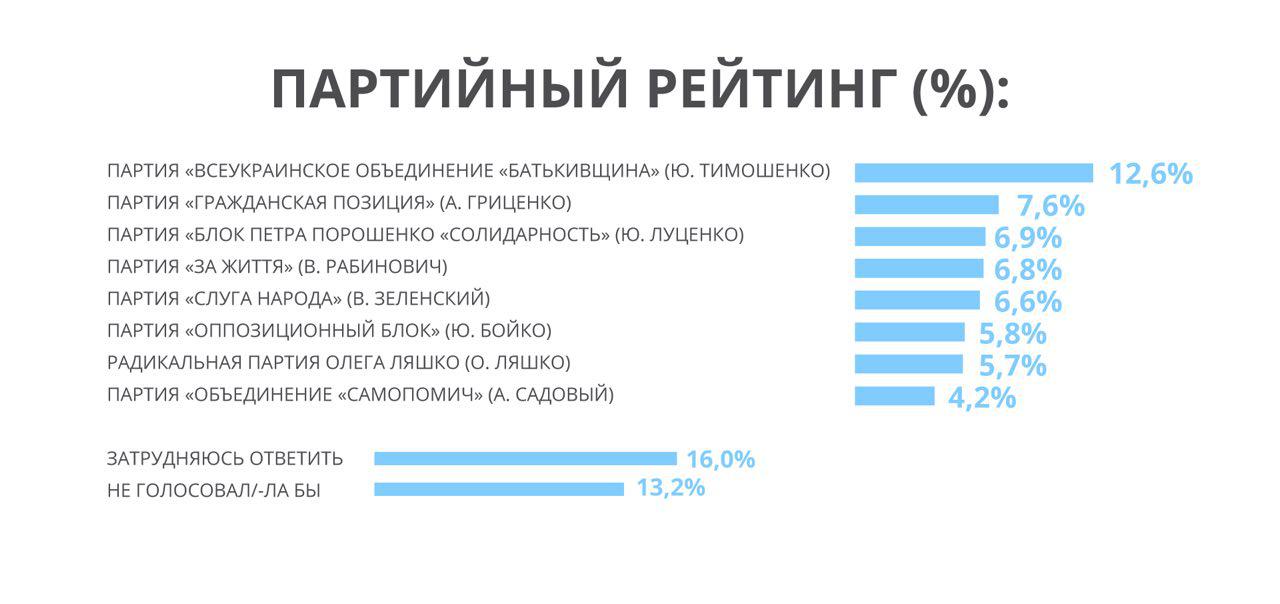 Также, как сообщают социологи, стали известны и парламентские предпочтения жителей Украины. Если бы выборы в Верховную Раду проходили в ближайшее воскресенье, то существующий барьер в 5% преодолели бы, по мнению всех опрошенных респондентов, семь политических сил: «Батькивщина» Юлии Тимошенко (12,6%), «Гражданская позиция» Анатолия Гриценко (7,6%), «Блок Петра Порошенко» (6,9%), партия «За життя» Вадима Рабиновича (6,8%), партия «Слуга народа» Владимира Зеленского (6,6 %), партия «Оппозиционный блок» Юрия Бойко (5,8 %) и Радикальная партия Олега Ляшко (5,7 %). На пороге пятипроцентного барьера также «Самопомич» Андрея Садового (4,2%).