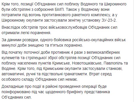 «Вследствие обстрелов трое военнослужащих Объединенных сил получили легкие ранения. По данным разведки, одного боевика российско-оккупационных войск за прошедшие сутки уничтожено и пятерых ранено», — уточняют в пресс-центре.