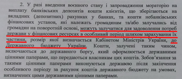 "В случае введения военного положения и наложения моратория на выплату банковских депозитов средства клиентов, которые находятся на вкладных (депозитных) счетах в банках, и средства небанковских финучреждений, которые принадлежат гражданам и/или привлекались от граждан на возвратной основе, могут привлекаться для удовлетворения потребностей государства в особый период путем зачисления их части, установленной Кабмином, в госбюджет", — говорится в документе.