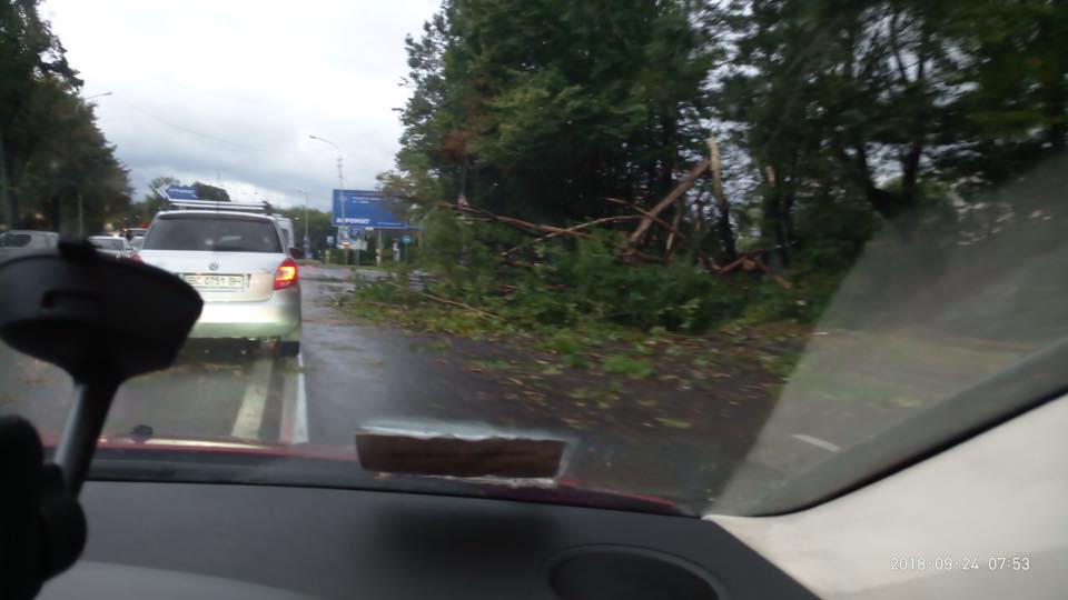 Также по словам Зинкевича, на улице Липинского у ГСО упало дерево. "Первая полоса занята, провода оборваны. Только что произошло", - написал он.
