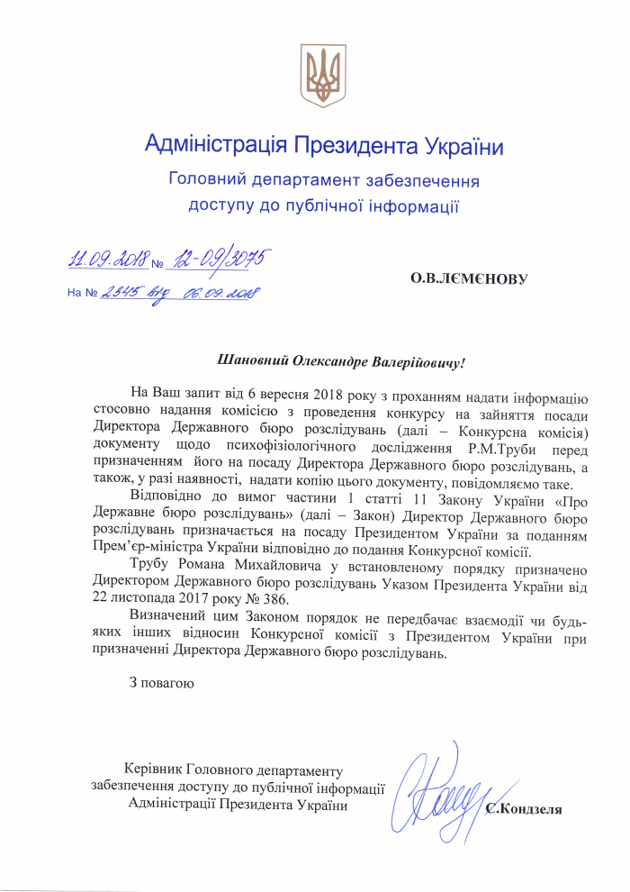 Поэтому, принимая во внимание постоянные манипуляции Романа Трубы относительно полиграфа, опубликуем ответ внешней комиссии. Согласно ее письму, закон не содержит требования о предоставлении комиссией каких-либо других документов при передаче представления премьер-министру Украины о назначении победителя конкурса Романа Михайловича Трубы директором ГБР. Так что комиссия не передавала его (Трубы) результаты психофизиологического исследования с использованием полиграфа.