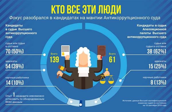 В последний день приема заявлений, 14 сентября, список желающих участвовать в конкурсе состоял уже из 130 человек. Позже в Высшей квалификационной комиссии судей (ВККС), которая согласно закону будет проводить отбор претендентов, заявили, что число конкурсантов достигло 200. И хотя эта цифра также не окончательная, можно сделать вывод о том, что на одну должность в Антикоррупционном суде претендуют пять кандидатов. Необходимо, правда, уточнить, что 27 из 39 вакансий в ВАКС — это должности самих судей, а еще 12 — членов апелляционной палаты. Желающих попасть в нее раза в два больше, чем тех, кто подал заявку на конкурс судей.