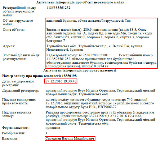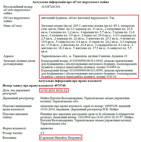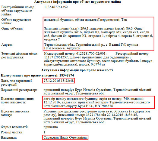 Ну і на останок, Надія Омелянівна Сарахман (1959 року народження) з 1989 року працюєвчителем математики у Тернопільській загальноосвітній школі І-ІІІ ст. №26 імені Дмитра Заплітного і ніколи не займалася бізнесом. Тож виникає логічне запитання, звідки у неї кошти на придбання чи будівництво цього житла і чи не лише формальним його власником вона є.