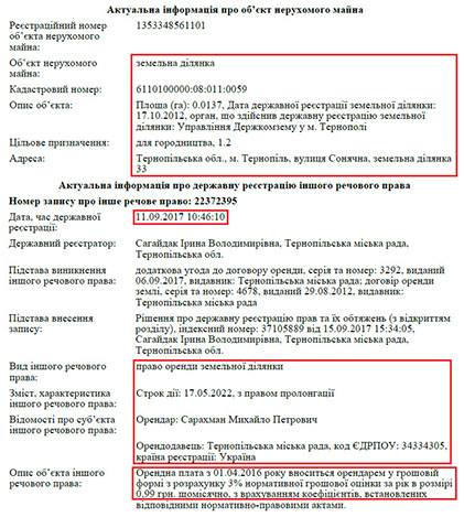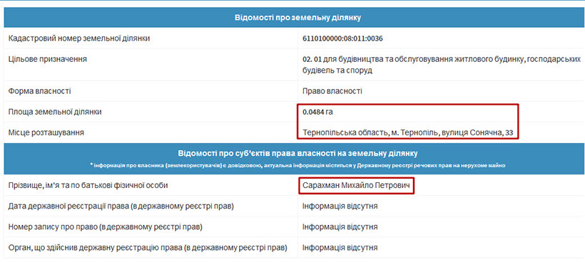 Ми також проаналізували майно найближчих родичів прокурора. Вище згаданий батько прокурора Михайло Петрович Сарахман має у своїй власності будинок площею 265 кв. м. та три земельні ділянки під ним. Це житло 62-річного Михайла Петровича розташоване в самому Тернополі, по вулиці Сонячній. До речі, одну із земельних ділянок він орендує у Тернопільської міськради за " 0,99 грн. Щомісячно". У відкритих реєстрах та аналітичній системі YouControl нам теж не вдалося знайти жодного бізнесу Михайла Сарахмана, тож звідки кошти на це майно – невідомо.