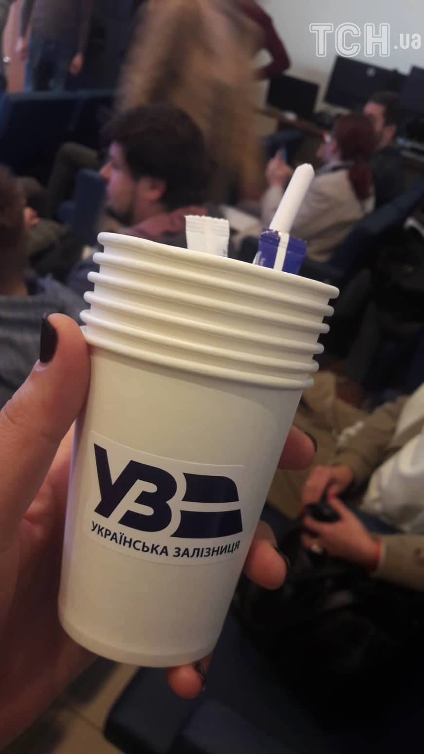 На первый путь вокзала "Киев-Пассажирский" подали пассажирский и грузовой поезда, забрендированные новым логотипом, присутствующим продемонстрируют образцы брендированной продукции.