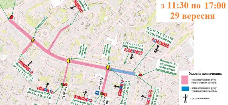 Также с 11:30 до 17:00 29 сентября (в субботу) перекроют улицу Крещатик на участке от Майдана Независимости до Европейской площади, а также улицу Михайловскую на участке от Крещатика до Костельной.