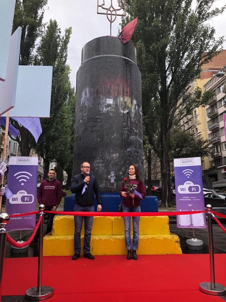 Как сообщает "Информатор", во время открытия у участников мероприятия с собой были плакаты с лозунгами, предлагающими выдавать пенсию в биткоинах, а рассказать, что за приложение необходимо скачать, чтобы увидеть памятник, смогли не только участники открытия.