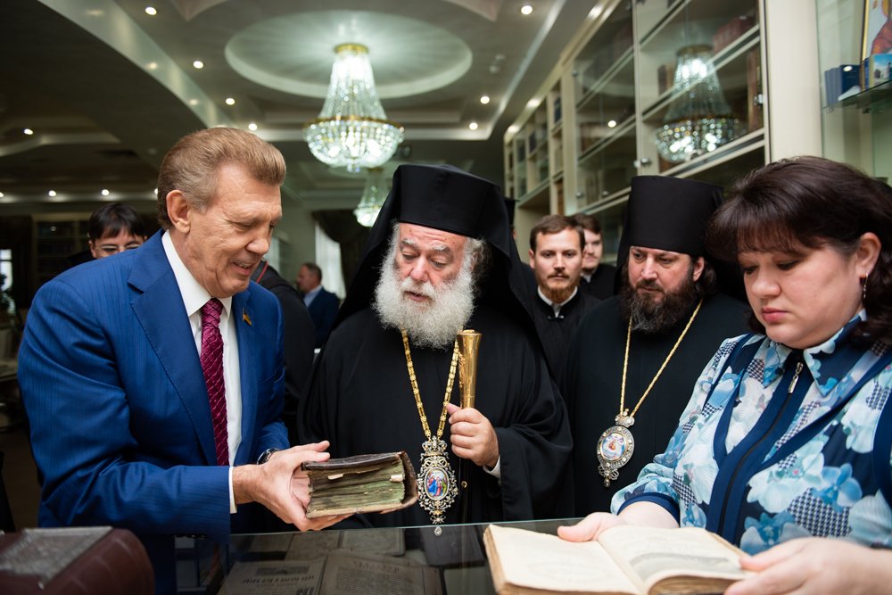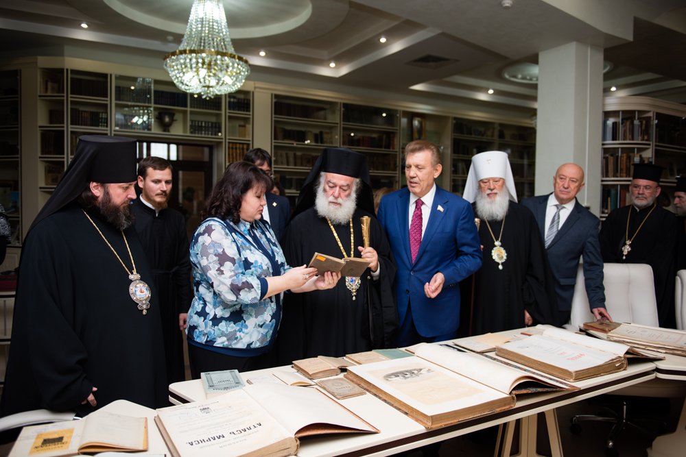 Там высокие гости с интересом осмотрели уникальные документы и раритетные книги отдела редких изданий. Особое внимание привлекли старинные церковные книги.