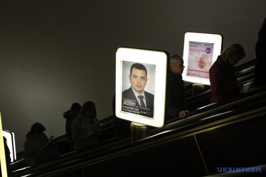 В столичном метрополитене 1 октября появилась реклама с изображением директора Национального антикоррупционного бюро Артема Сытника, сообщает корреспондент Укринформа.