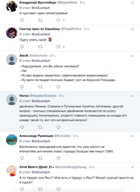 «Получается, что Красная площадь — это прогулочный дворик психбольницы. В таком случае Кремль — это вообще, стыдно сказать, страшно подумать что», «Путин уже говорил, что Дмитрий Навка пургу несет. Нет веры ему более», «15 бегают, а один лежит. Или он тоже иногда бегает?», «А сколько у нас Наполеонов в палатах лежат не сосчитать», «Аргументация уровень: пресс-секретарь президента РФ», «У нас в Кремле бегают 15 Путиных. И все чрезвычайно похожи на оригинал», — шутят пользователи.