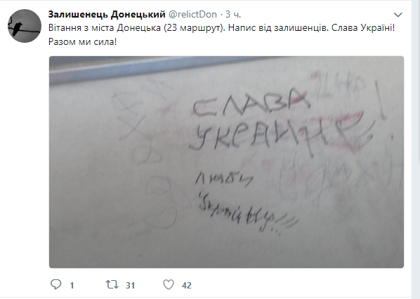 На своей странице в Twitter блогер Залишенець Донецький опубликовал фото надписи, сделанной в салоне маршрутки №23, которую оставил какой-то патриотически настроенный пассажир из смелых пассажиров. На снимке видно, что на стене салона написано «Слава Украине», «Люби Україну», а также менее заметное «„ДНР“, сдохни».