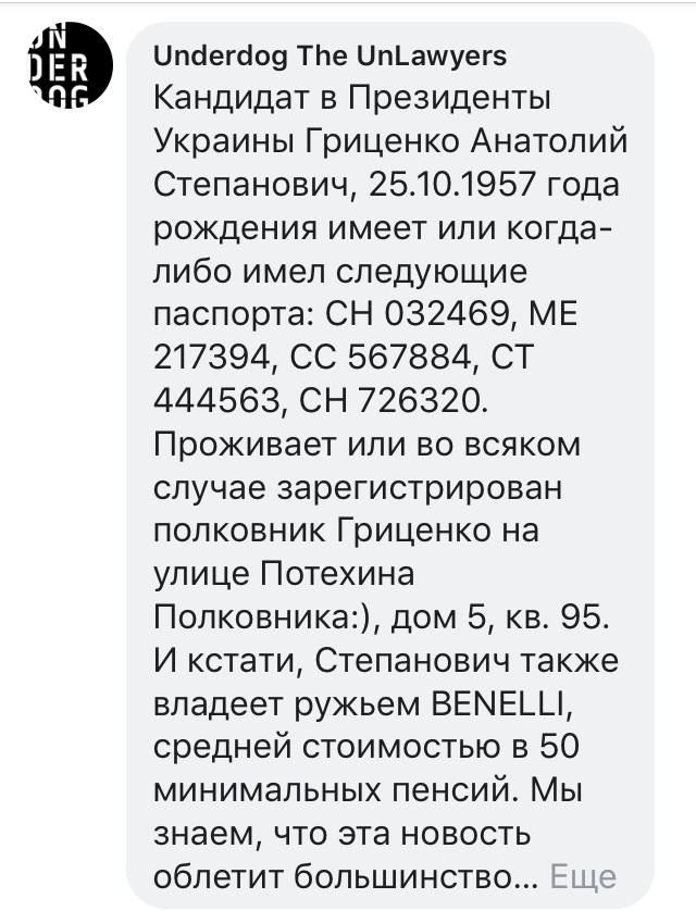Траблшутинговая компания «Underdog The UnLawyers» на своей странице в Facebook опубликовала личные данные кандидата в Президенты Украины Анатолия Гриценко.