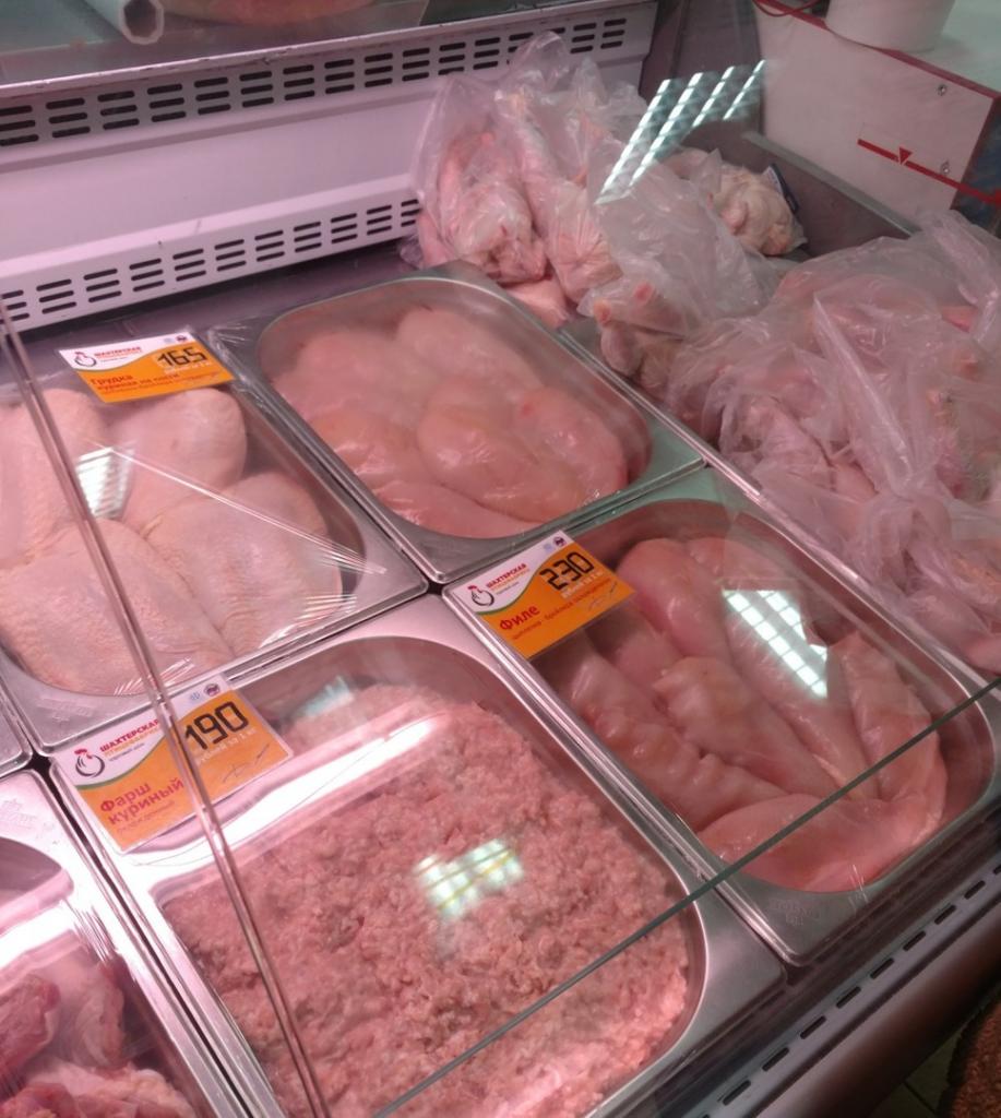 Так, в одном из пабликов в соцсети опубликованы фото витрин магазина и цен на куриное мясо и субпродукты. Под фото написно: «Донецк. Сегодняшние цены на продукцию „Шахтерская птицефабрика“».