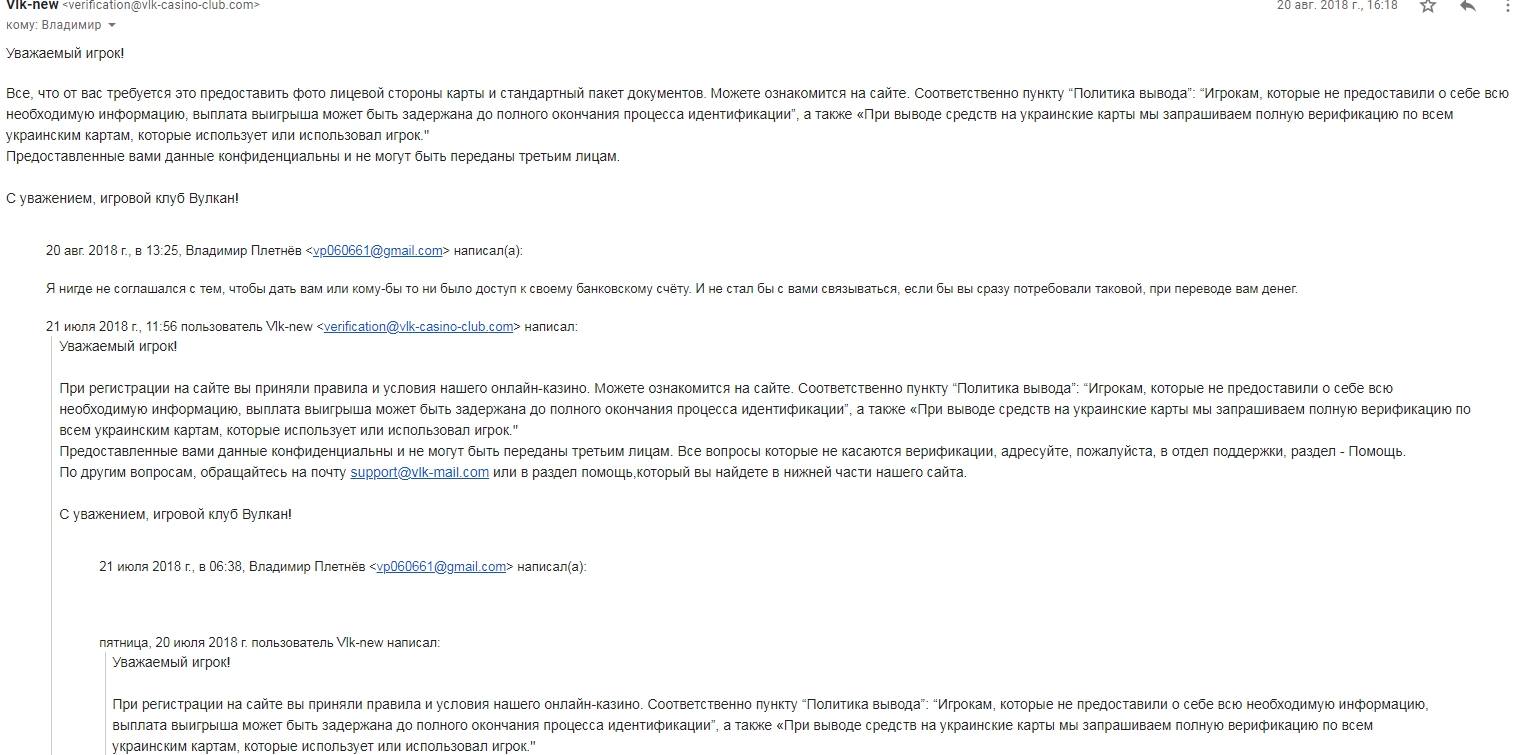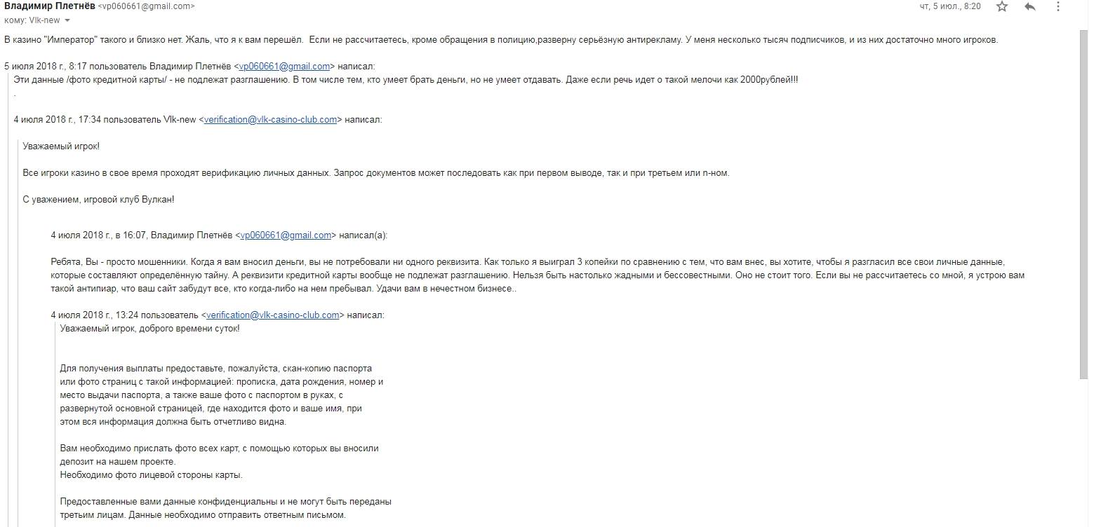 Об этом стало известно после опубликованных хакером Sean Baker данных из личного электронного ящика Владимира Плетнева. В частности, речь идет о переписке Владимира Васильевича с администраторами online казино “ВУЛКАН” в которой он требует выплатить его выигрыш в размере около 2 000 рублей (прим. ред. около 800 грн.), отмечая, что в казино “Император” и близко не было никаких проблем с оплатами.