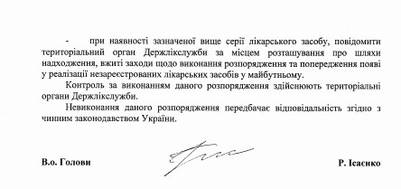 Аптеки обязаны проверить наличие у себя всех серий препарата и изъять его из оборота, уничтожив или вернув поставщику, а затем отчитаться перед Гослекслужбой о выполнении распоряжения.
