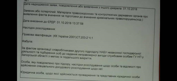 Одне з них зареєстроване за фактом «організації співробітниками другого підрозділу НАБУ незаконної господарської діяльності та підбурення осіб до надання неправомірної вигоди службовим особам ГУ Націоанльної поліції у Запорізькій області». Йому надана правова кваліфікація за ч.1 ст. 203-2 Кримінального кодексу України. Нагадаємо, що 14 вересня 2018 року, під час прес-конференції, Перший заступник Голови Служби безпеки України Павло Демчина поінформував широкий загал про те, що співробітниками НАБУ було організовано діляьність нелегального грального закладу - «казино», буцімто з метою викриття топ-корупціонерів.