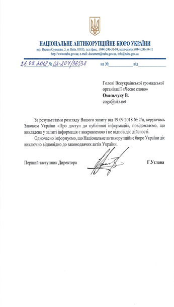 У відповідь на запит ВГО «Чесне Слово» Перший заступник Директора НАБУ Гізо Углава повідомив громадськості про те, що «викладена у запиті інформація є викривленою і не відповідає дійсності».