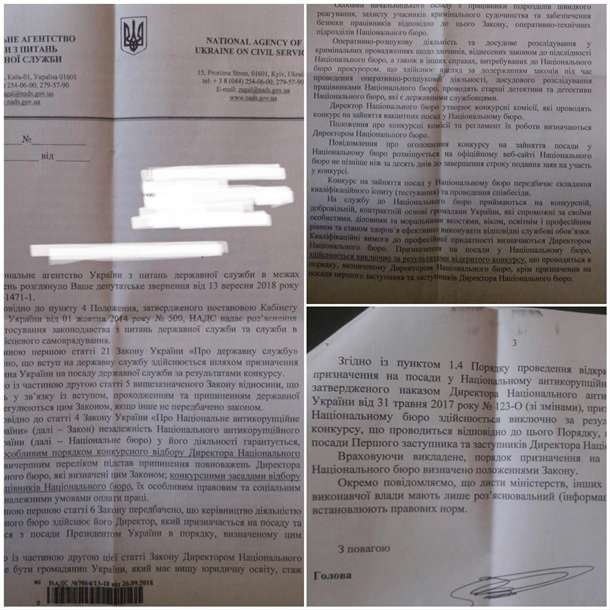 В нашому розпорядженні опинився лист з роз’ясненнями Національного агентства України з питань державної служби, яким роз’яснюється порядок прийому на роботу співробітників НАБУ. Відповідно до статті 4 Закону України «Про Національне антикорупційне бюро України» незалежність НАБУ у його діяльності гарантується, зокрема, особливим порядком конкурсного відбору Директора НАБУ та вичерпним переліком підстав припинення повноважень Директора НАБУ, які визначені Законом; конкурсними засадами відбору інших працівників НАБУ, їх особливим правовим та соціальним захистом, належними умовами оплати праці.