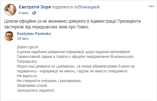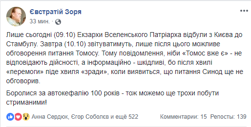 "Только сегодня (09.10) экзарх Вселенского Патриарха отбыли из Киева в Стамбул. Завтра (10.10) отчитываться, только после этого возможно обсуждение вопроса Томоса. Поэтому сообщение, что "Томос уже есть" не соответствуют действительности, а информационно - вредны, потому что после волны "перемоги" пойдет волна "зрады", когда окажется, что вопрос Синод еще не обсудил", - написал Зоря, порекомендовав всем "побыть сдержанными".