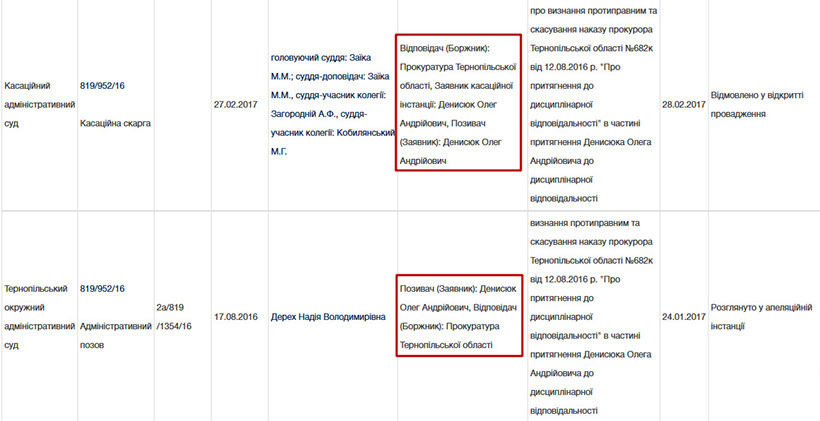 «Денисюка (Олег Денисюк, екс-прокурор Кременецької місцевої прокуратури – авт.) відсторонено від виконання обов’язків. Було службове розслідування, за результатами якого він отримав догану. Він її оскаржував у суді, але суд його позов відхилив. Щодо нього відкрито кримінальне провадження за невиконання рішення суду, яке стосувалося його службової діяльності. Провадження передане в ГПУ для визначення підслідності, щоб нас не звинувачували в упередженості".