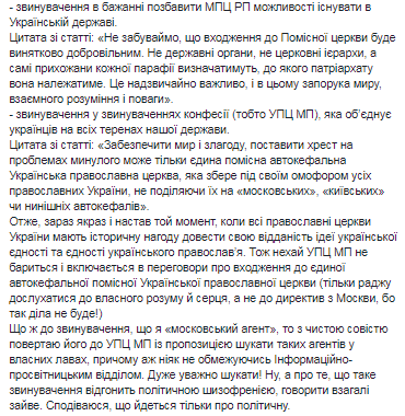 "Сейчас наступил как раз тот момент, когда у всех православных церквей Украины есть историческая возможность доказать свою преданность идее украинского единства и и единства украинского православия. Пусть УПЦ МП не медлит и включается в переговоры о вхождении в единую автокефальную поместную Украинскую православную церковь", - написал он.