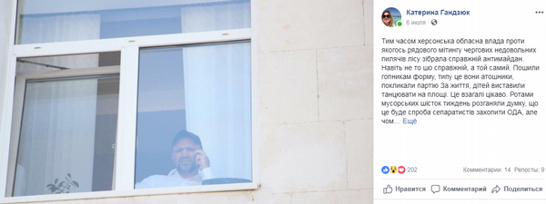 На эту тему Гандзюк сделала несколько заметок в Фейсбуке. В одной из них отметила, что губернатор Андрей Гордеев «выполняет поручение Владислава Мангера разобраться с митингом, который привлекает излишнее внимание к незаконной вырубке», назвав при этом Мангера «помощником титульного сепара»: