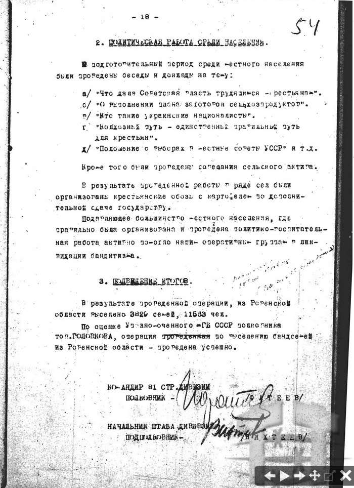 Выдержка из итогового отчёта о проведении операции "Запад" в Ровенской области, здесь ход укрепления "дружбы народов" расписан буквально по часам — насколько именно дружба укрепилась в 10, 12, 14 и 16 часов в день 21 октября 1947 года: