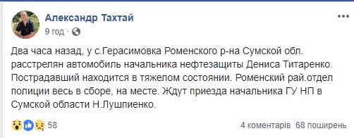 Блогер Александр Тахтай написал на странице в Facebook, что жертвой нападения стал Денис Титаренко. Он находится в тяжелом состоянии.