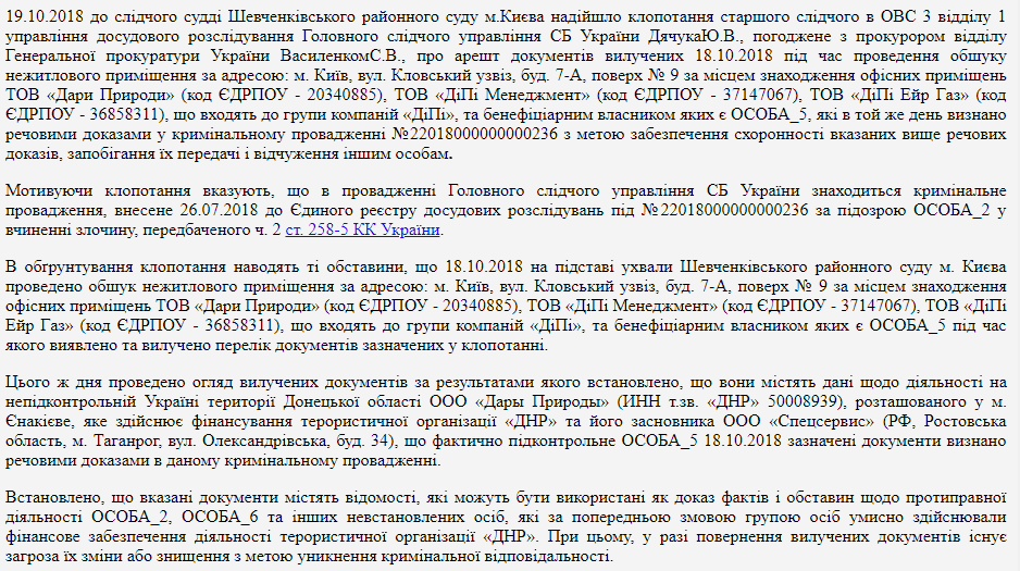 «Установлено, что ООО «ДиПи Эйр Газ» специализируется на производстве и реализации промышленных газов (гелия, аргона, пропана, закиси азота и т.д.), фармацевтических препаратов. Должностные лица указанного ООО с целью уклонения от уплаты налогов и пошлин в государственный бюджет Украины применяют схему оформления внешнеэкономических импортных контрактов с иностранными контрагентами, но фактически закупают товар у субъектов хозяйствования, находящихся на временно оккупированных территориях Донецкой области и РФ. Так, ООО «ДиПи Эйр Газ» в 2016-2017 годах осуществляло поставки из РФ в режиме «импорт» следующих товаров: «аргон жидкий высшего сорта», «инертный газ» и «пропан».