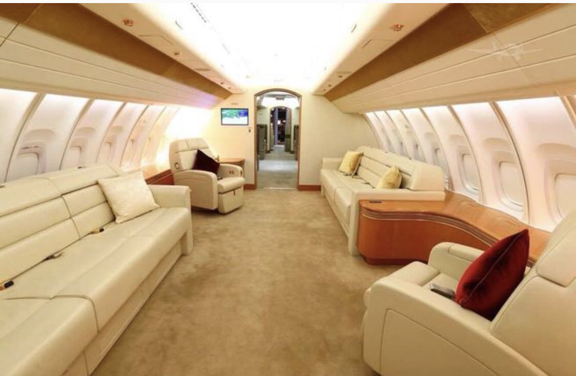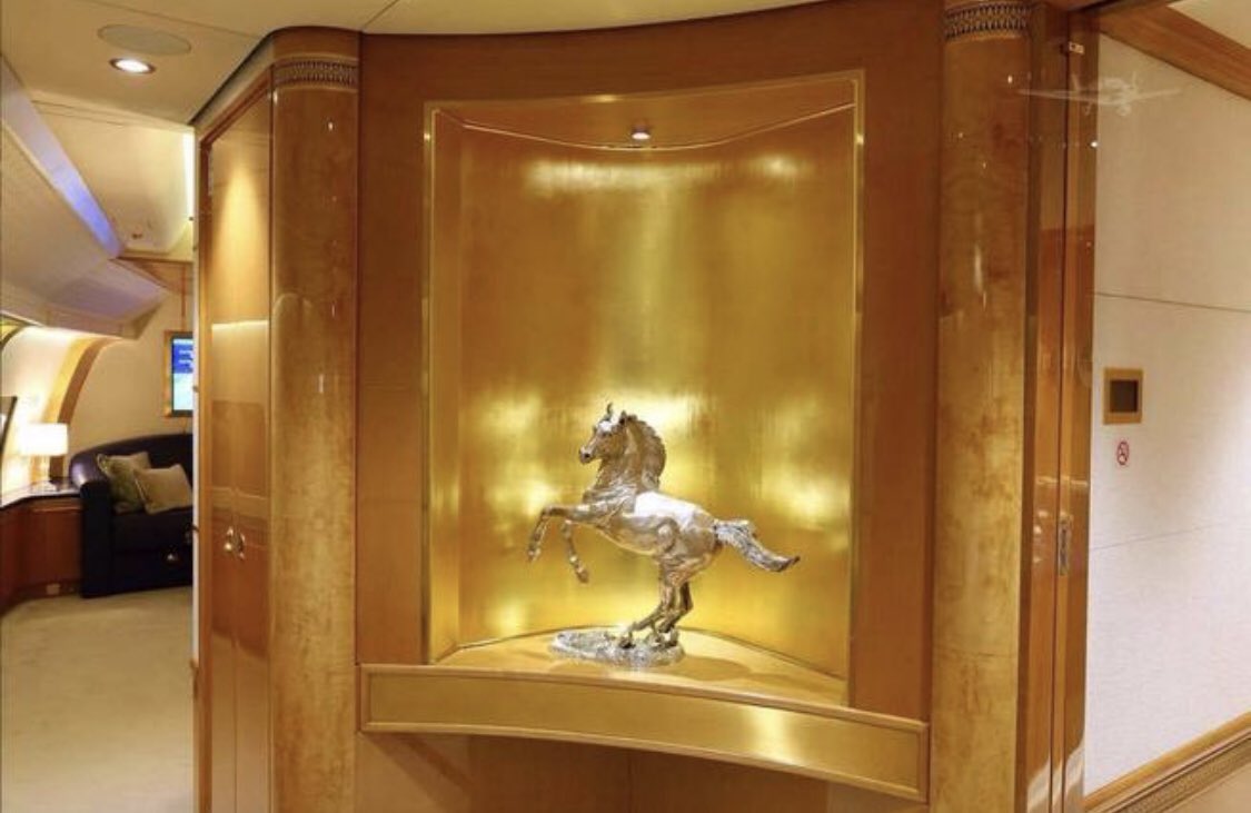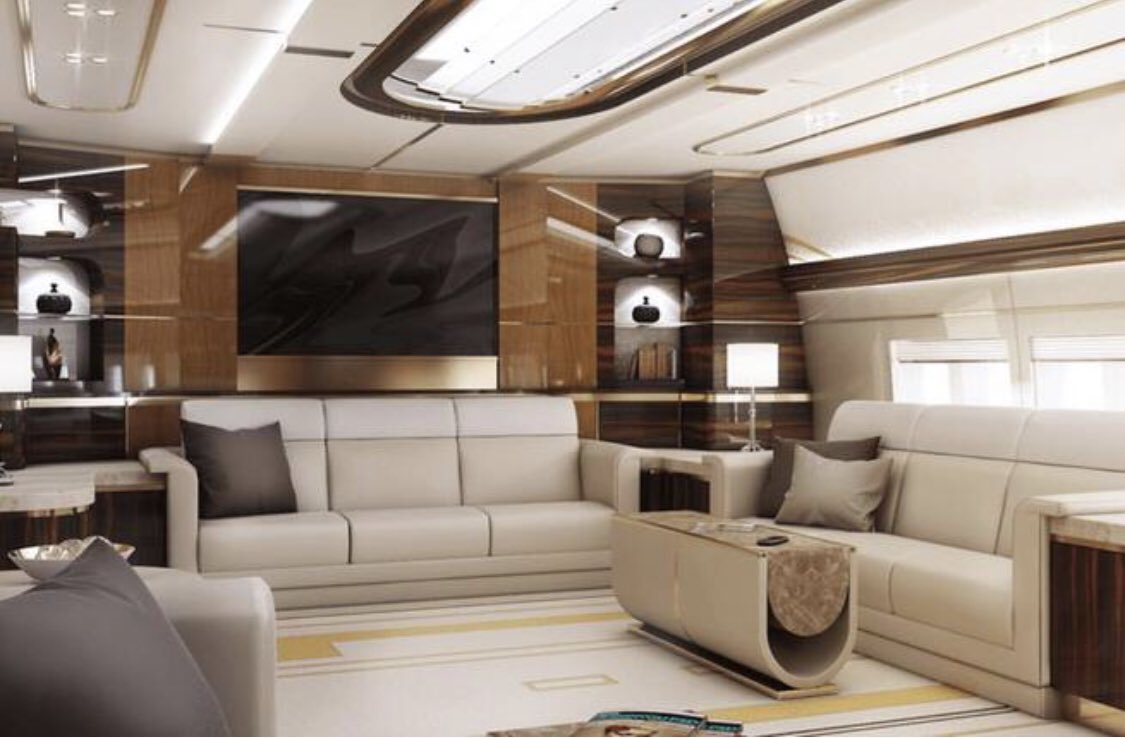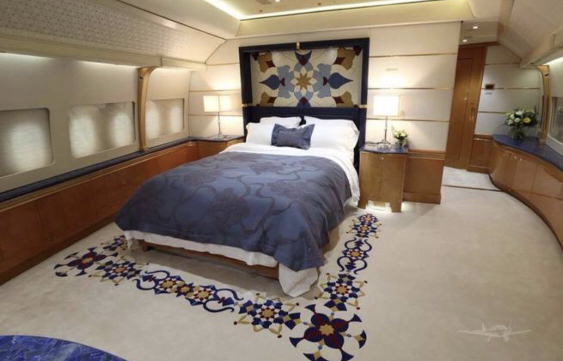 Согласно опубликованным в сети фотографиям, в воздушном судне есть собственная спальня с роскошной двухместной кроватью, гостиная, комната для переговоров, столовая на 14 персон, несколько залов для совещаний, десять ванных комнат и уборных. В цветовой гамме преобладают голубой и золотой цвета. Для оказания срочной помощи на борту предусмотрен свой полноценный медицинский блок с операционной. На обоих этажах отведено обширное пространство для отдыха.