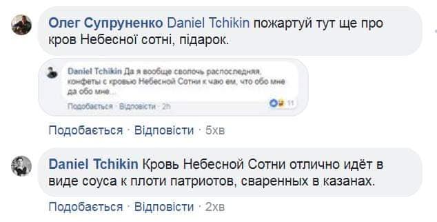 Например, пользователей Михаил Губа написал: “То чувство, когда уже давно закидывалась кислотой”. Таким “забавным” образом он отвечал на эмоциональный пост Екатерины о людях, голосовавших за Порошенко. “Кто убил Кеннеди”, – юморит Татьяна Мисиюк. А вот Данил Чикин угрожает всем тем, кто высказывается негативно о Порошенко приготовиться к участи Екатерины Гандзюк.