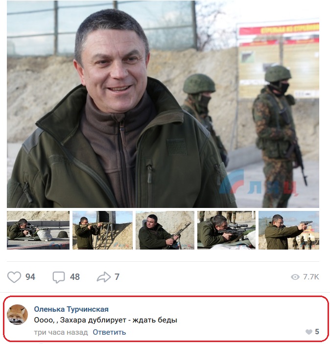 Как и ожидалось, на стене сообщества публикуется военная пропаганда, главарь псевдореспублики позирует с оружием.