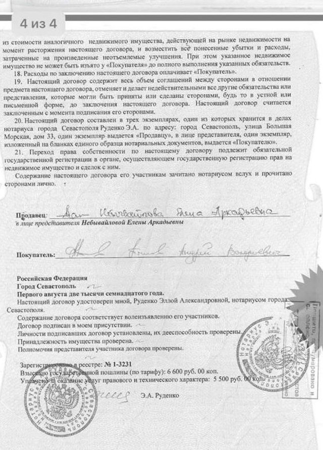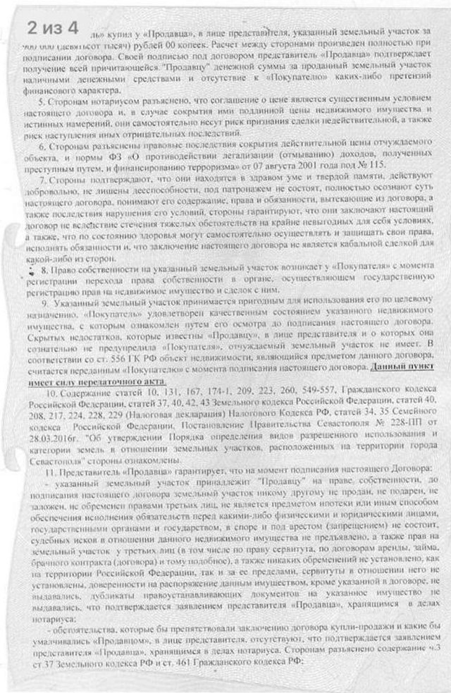 1 серпня 2017 року реєстраційними органами окупаційної влади РФ в м. Севастополь зареєстровано право власності Ситник Ганни Миколаївни на земельну ділянку площею 0,0416 га, розташовану за адресою: м. Севастополь, Нахімовський район, садівниче товариство «Міраж», №Б-35. Того ж дня Небивайлова О.А., діючи від імені Ситник Г.М., на тимчасово окупованій території міста Севастополь здійснює продаж цієї ділянки громадянину РФ Пилову А.В. (паспорт 4514662140, виданий Федеральною міграційною службою 19 квітня 2014 року) за 900 000 російських рублів (~$ 14 984,2 за курсом Центробанку РФ станом на 01.08.2017), з яких 6 600 російських рублів сплачено до російського бюджету у вигляді мита. Завіряє договір купівлі-продажу севастопольський нотаріус Руденко Е.О.