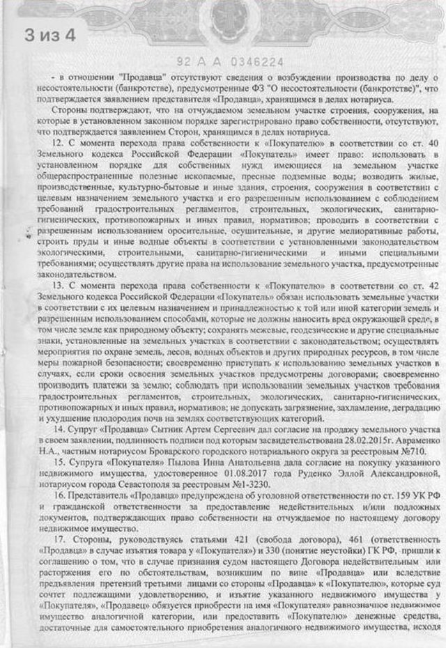 28 лютого 2015 року пані Ситник дає доручення на право відчуження майна громадянці РФ Небивайловій О.А. (паспорт 4614469910, виданий Федеральною міграційною службою 7 травня 2014 року). Того ж дня Артем Ситник, який, якщо вірити офіційному сайту НАБУ, ще в січні 2015 року, в зв”язку з відсутністю істотних позитивних зрушень у сфері боротьби з корупцією прийняв рішення взяти участь в конкурсі на зайняття посади Директора антикорупційного бюро України, дав своїй дружині згоду на відчуження зазначеної ділянки.