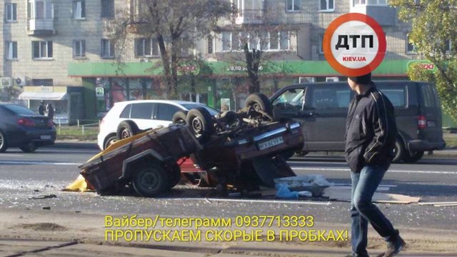 Пробка на Харьковском шоссе: в ДТП перевернулся “Москвич” с прицепом