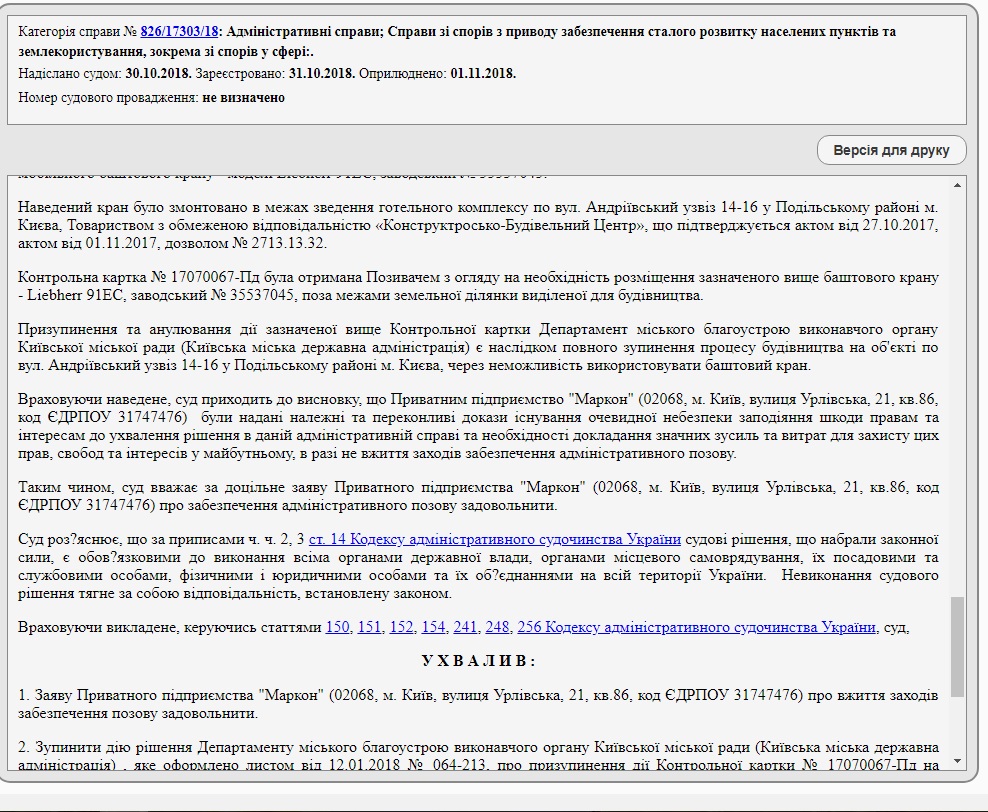 Решением от 29 октября 2018 году судья Окружного административного суда Киева Андрей Федорчук постановил приостановить действие решения Департамента городского благоустройства и сохранения природной среды КГГА о приостановлении действия контрольной карточки № 17070067-Ю на временное нарушение благоустройства и его восстановление, выданной истцу. Также судья постановил приостановить действие решения Департамента городского благоустройства и сохранения природной среды КГГА об аннулировании действия указанной контрольной карточки.
