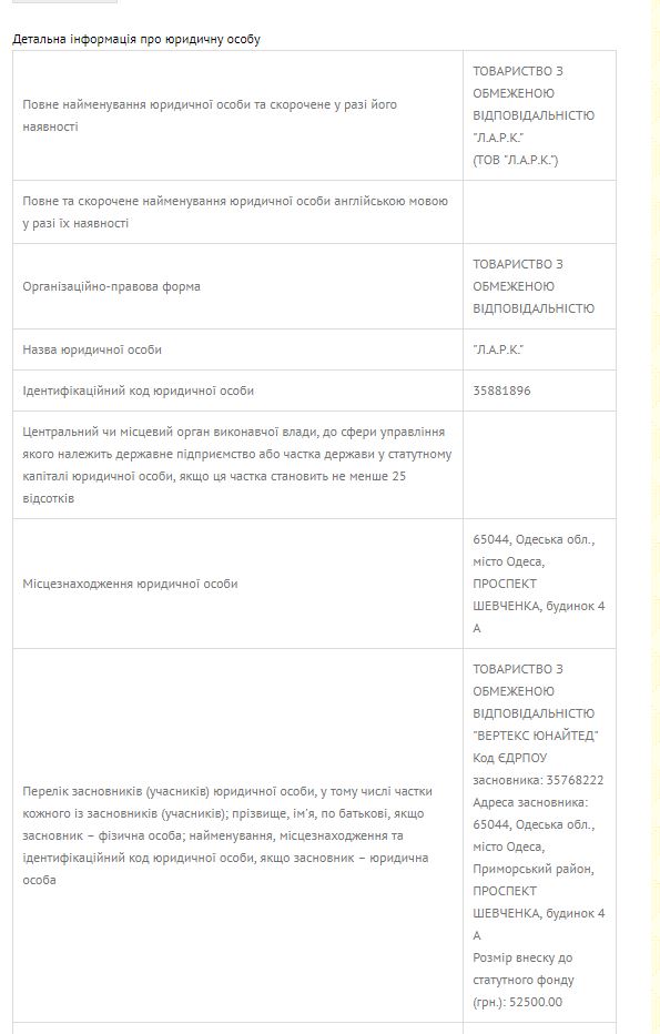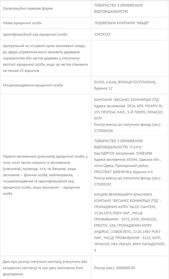 Выиграло лот ООО “Строительная компания “КВАДР”, которым управляет Долиненко Оксана Владимировна и которое основано кипрской компанией “Фесанес коммершл ЛТД” (владельцы Тасос Пантели и Андреас Софоклеус), а также одесским ООО “Л.А.Р.К.”. И все бы ничего, да только собственником компании “Л.А.Р.К.” является другое одесское ООО “Вертекс Юнайтед”.